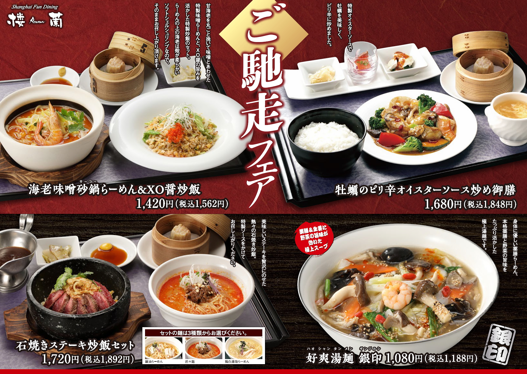 楼蘭ではこの季節ならではの熱々のご馳走が勢揃い。寒い季節ならではの熱々の砂鍋らーめんや、石焼ステーキ炒飯に薬膳らーめんなどの特製料理を、ゆっくりと楽しみください。